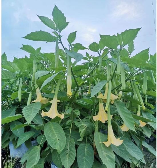 曼陀罗花又叫洋金花、大喇叭花、山茄子,夕颜,全株有毒。源产地于印度,喜温暖、向阳及排水良好的砂质壤土。多野生在田间、沟旁、道边、河岸、山坡等地方,也有用作盆栽栽培。我国各地都有分部,常见种有曼陀罗、毛曼陀罗、白花曼陀罗三种。